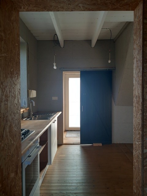 De keuken is voorzien van een dubbele spoelbak, oven en gasfornuis. In de uitbouw staat de bijkeuken, toilet en badkamer opgesteld. De badkamer is voorzien van een douche en wastafel.