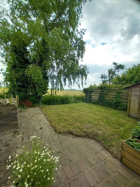 Wat een uitzicht! Hier kun je ongetwijfeld iets moois voor jezelf maken. Op dit moment is er een stenen terras, gras en een houten tuinhuisje.