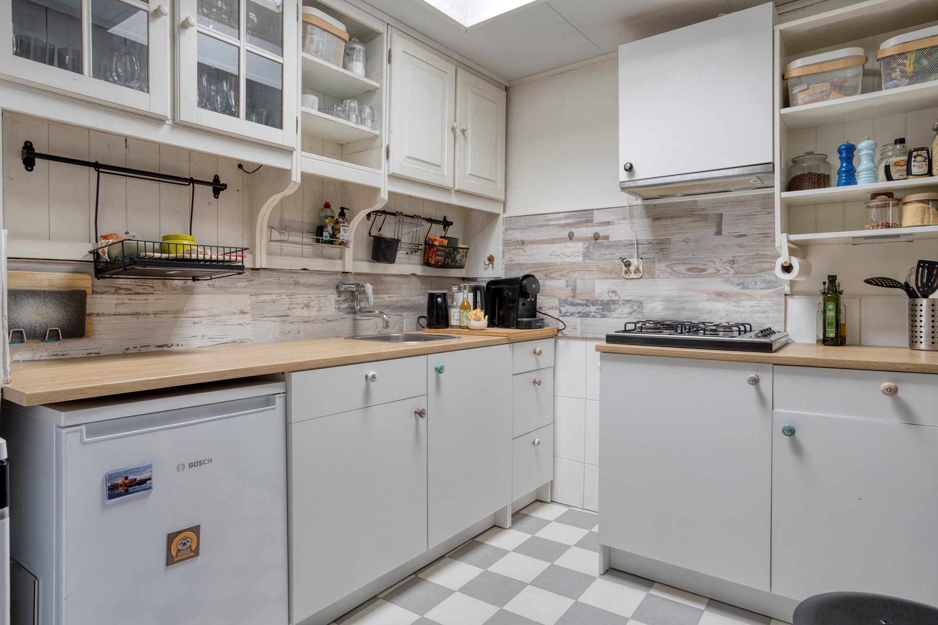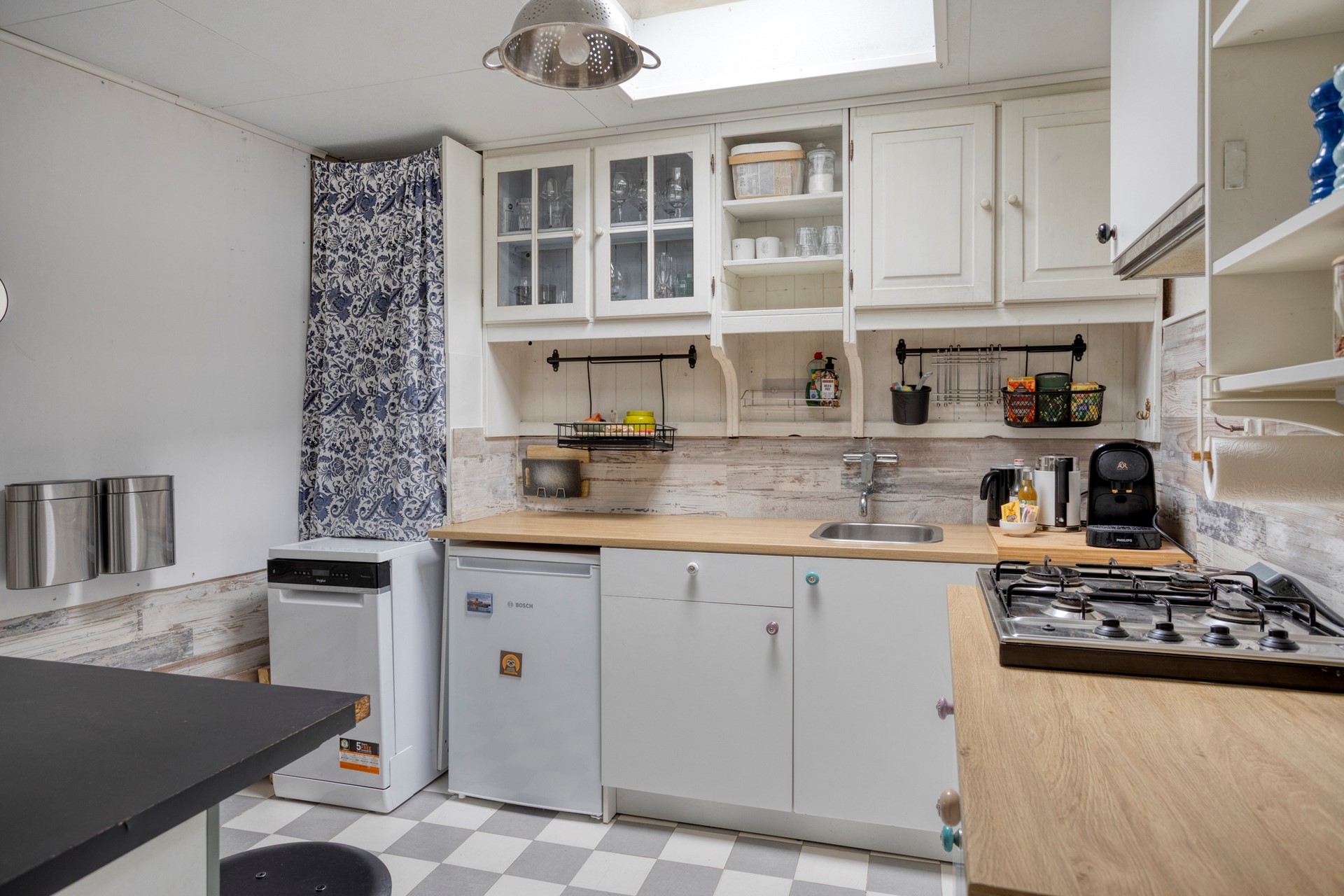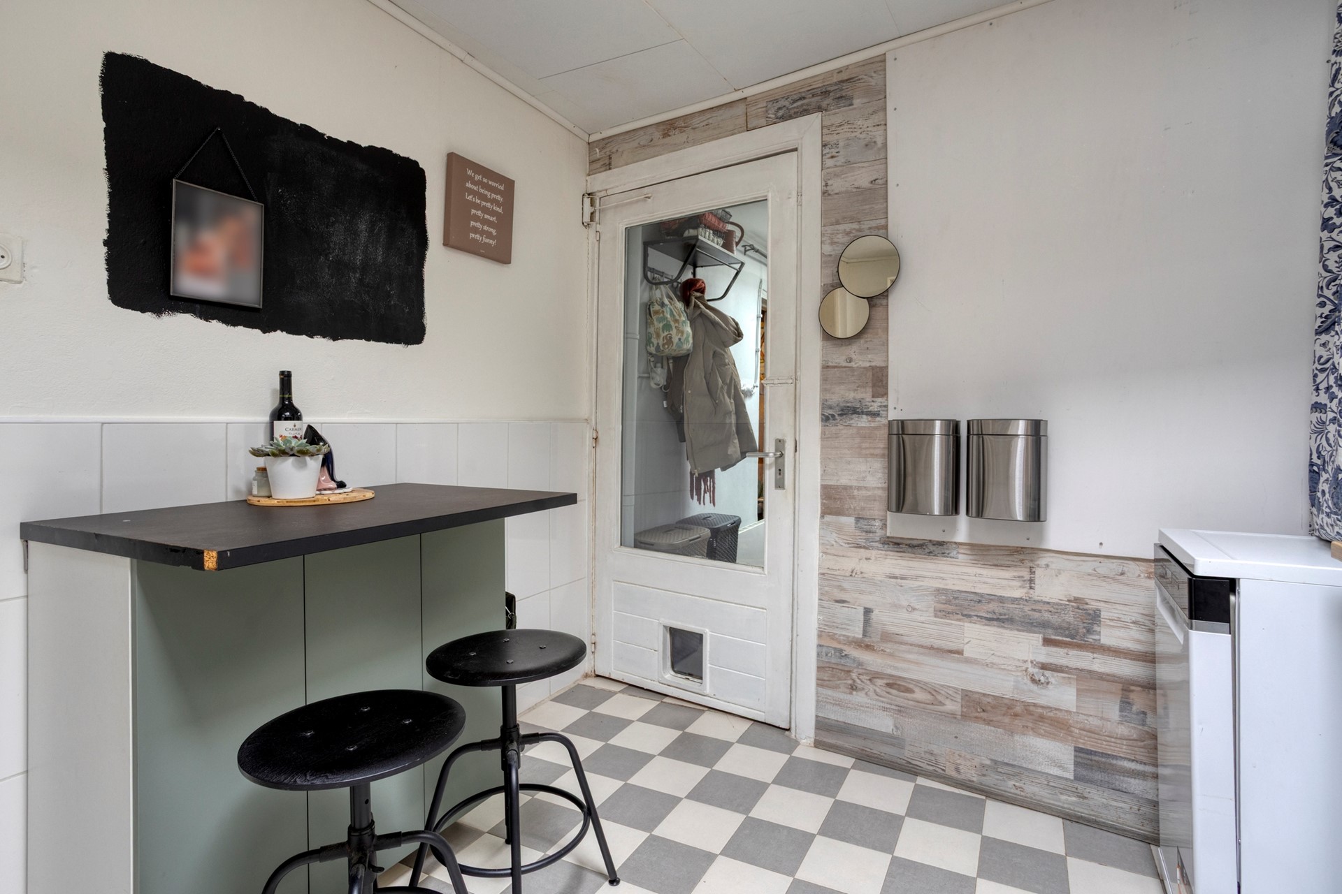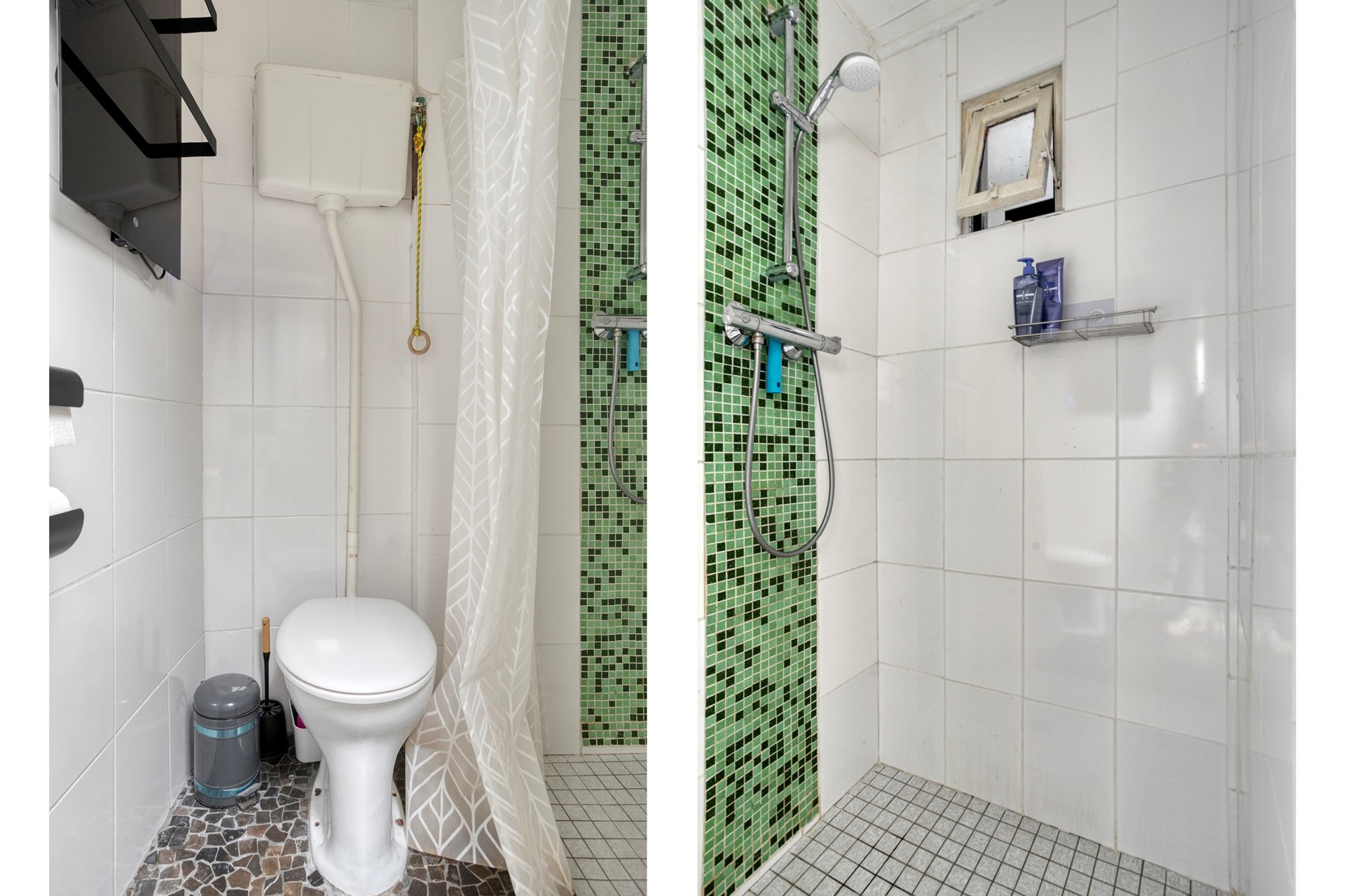 Aan de achterzijde van de woning bevindt zich de uitbouw, waar de keuken en bijkeuken zijn gesitueerd. Vanuit de bijkeuken is er toegang tot de badkamer, uitgerust met een douche en toilet. Daarnaast beschikt de woning over een praktische berging die directe toegang geeft tot de straat aan de voorzijde.