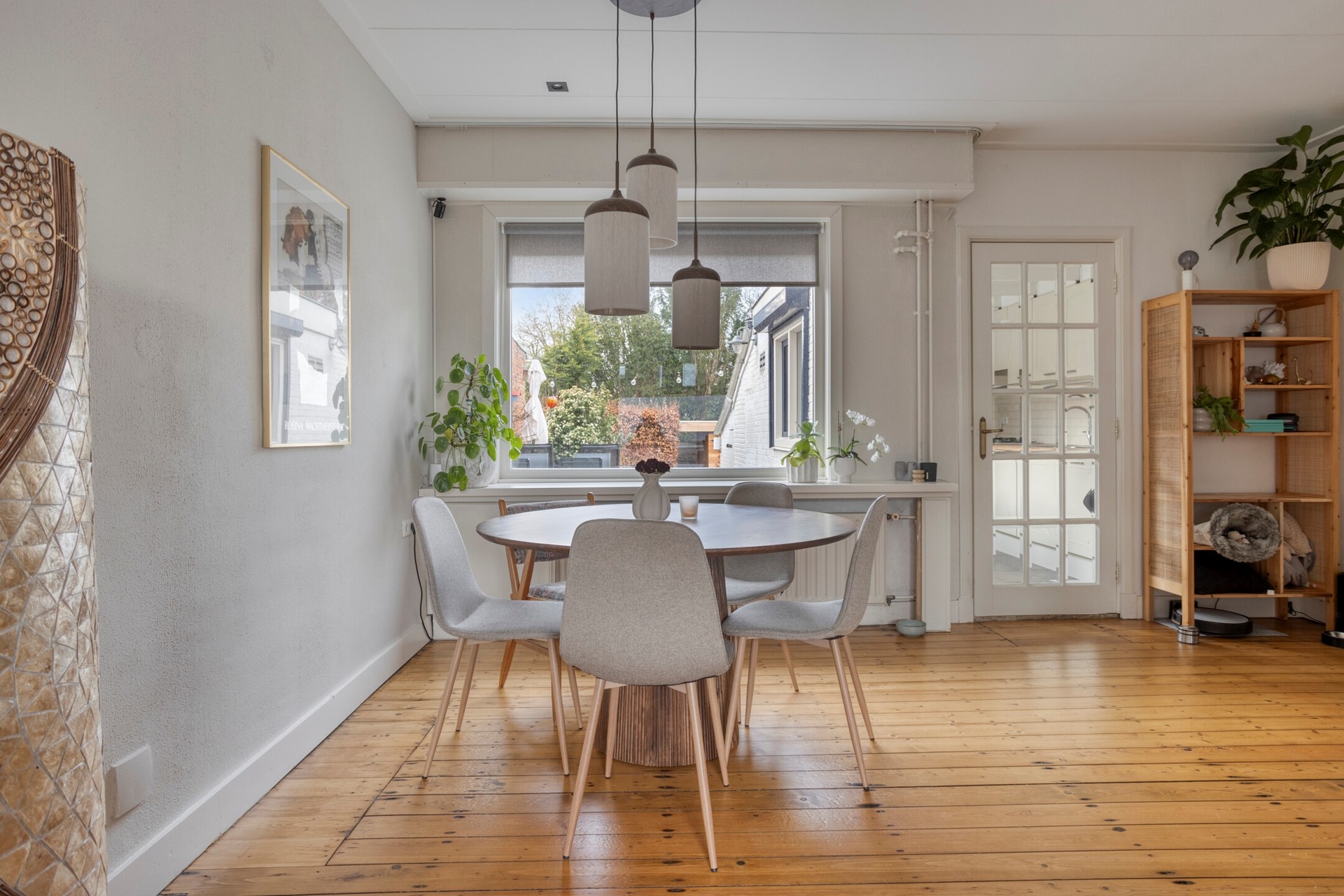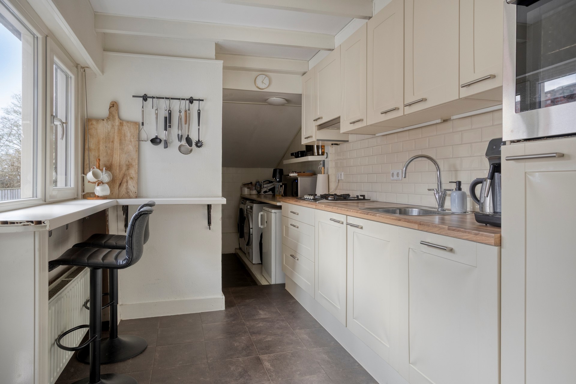 Inkom via de hal met meterkast, trapkast en doorgang naar de L-vorm woonkamer. De woonkamer is voorzien van een mooie houten vloer. Heerlijk veel licht, een makkelijke trapkast en de doorgang naar de uitbouw. De keuken met bijkeuken is voorzien van een grijze tegelvloer. In de keuken heb je de vaatwasser, gaskookplaat, koelkast, oven en flink wat werk- en kastruimte. In de bijkeuken heb je ook de aansluitingen voor de wasmachine en droger. Het toilet met fonteintje is ook netjes betegeld.